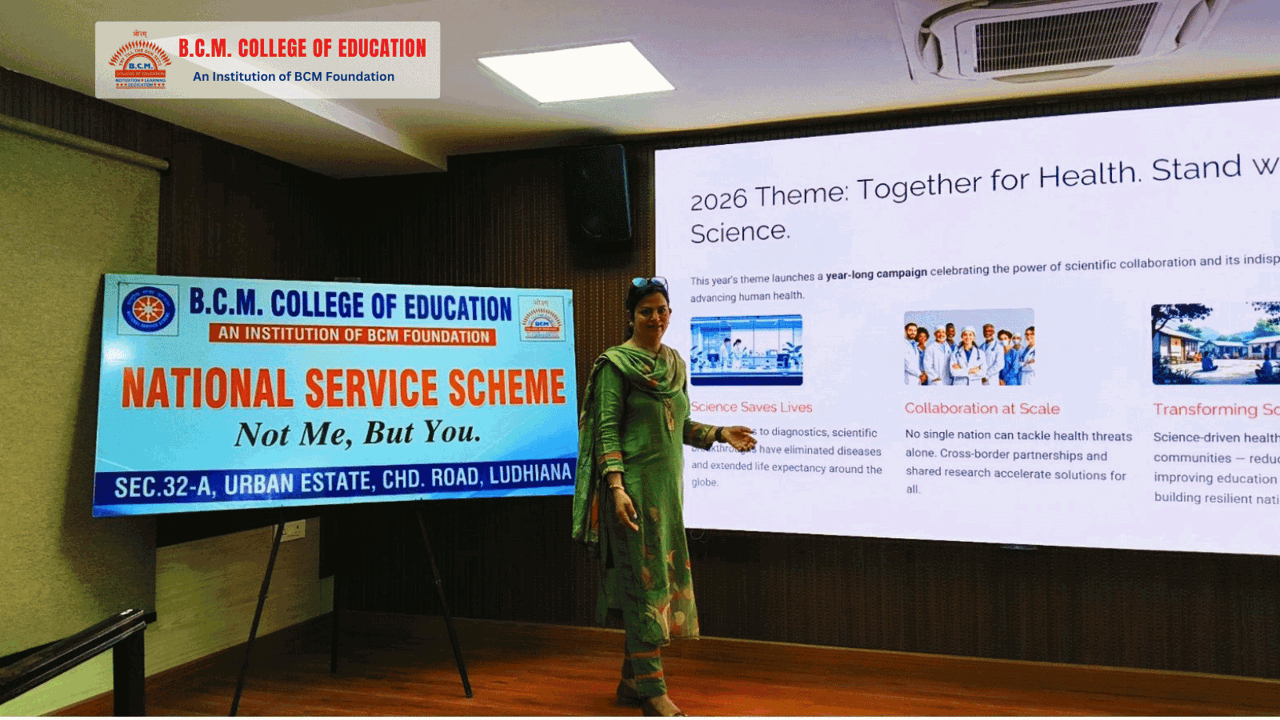 NSS Wing of BCM College under the aegis of Youth Services, Punjab celebrated World Health Day on the theme “Together for Health – Stand with Science.” The celebration sought to cultivate student-teachers as exemplars of healthy living, inspiring balanced nutrition, active exercise and resilient mental well-being.On this occasion, Dr. Ramandeep Arora delivered an insightful Extension Lecture, illuminating the multifaceted dimensions of health—physical, mental, social, and environmental—through an engaging and informative PowerPoint presentation. All the faculty members and students took a pledge, urging all to prioritize holistic wellness by embracing healthier habits and fostering community well-being. Principal Dr. Monika Dua commended the dedicated efforts of NSS Officers Mrs. Manjit Kaur and Dr. Amita Khosla, congratulating them for steering the event to resounding success and meaningful impact.